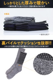【暖かい厚手の生地】 生地の厚みが1.5〜2倍の差があります。肌側はクッション性と保温性に優れたパイル生地です。パイルソックスは、クッション性が良く、保温性に優れています。さらに破れにくく頑丈などメリットが多いです。