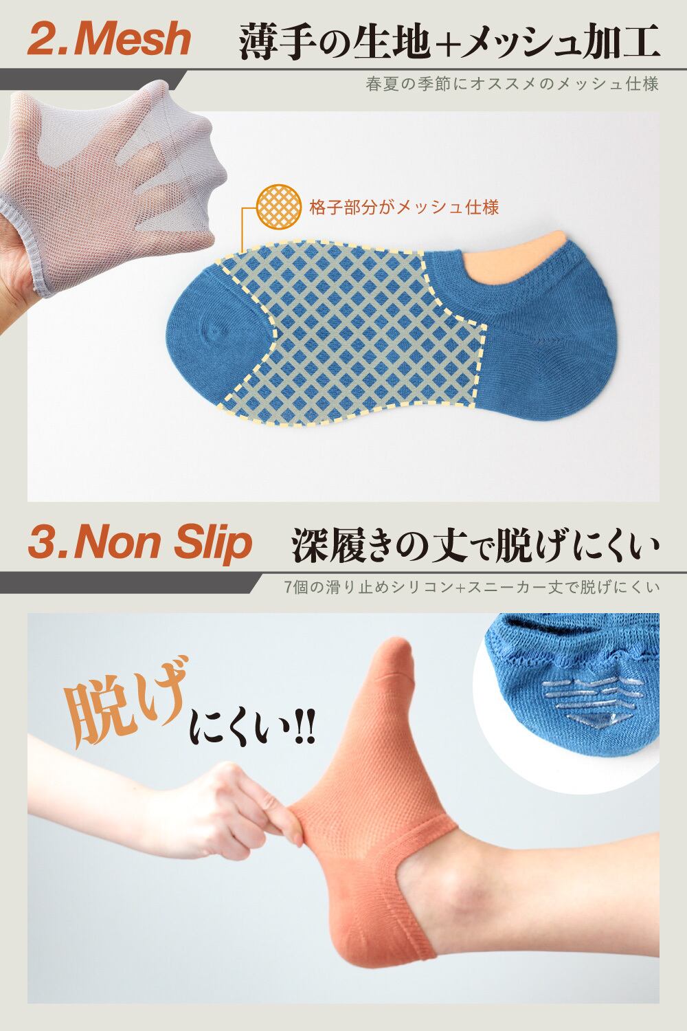 【甲部分と足底部分がメッシュ仕様】メッシュタイプのくるぶしソックスです。夏に嬉しいメッシュ加工で通気性がよく、薄手の綿混素材で、速乾性に優れています。