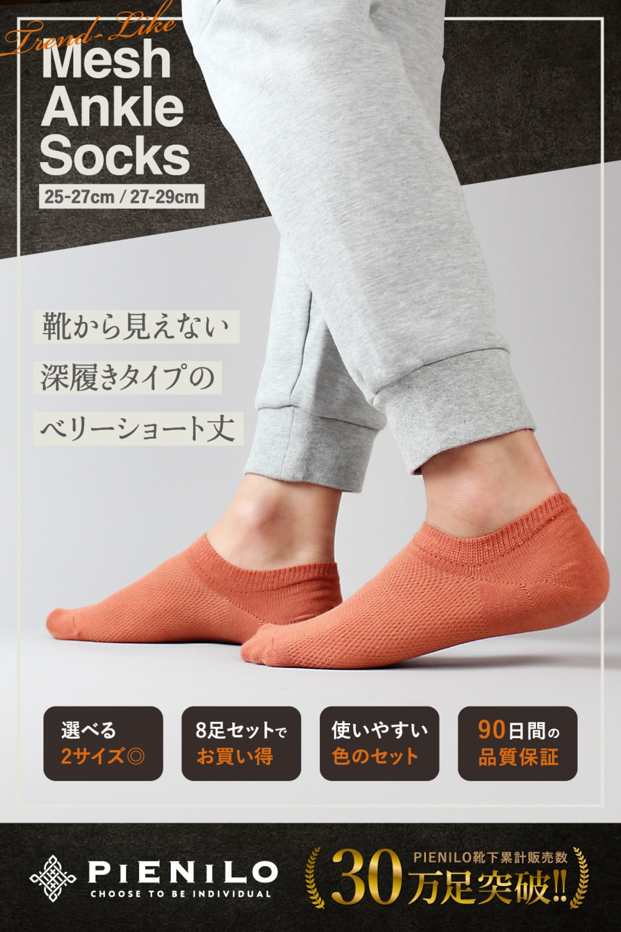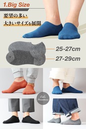 【2サイズのスニーカーソックス】25、26、27cmの普通サイズと、27、28、29cmの大きいサイズの2サイズをご用意しています。28cm、29cmのおおきいサイズのくるぶし丈のスニーカーソックスをお探しの方にオススメです。